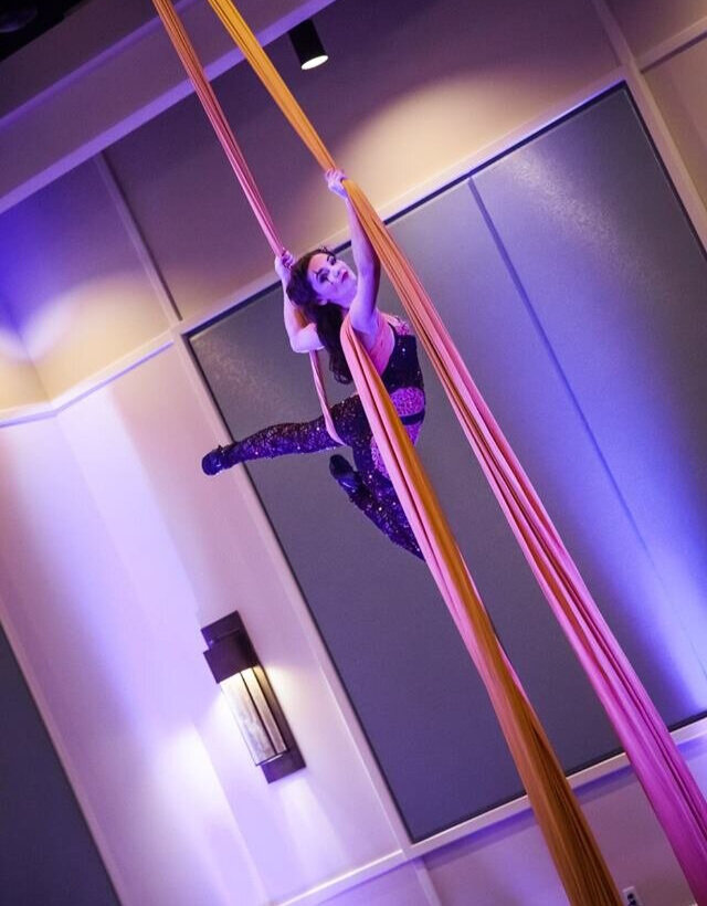 Our talented aerialists perform a choreographed routine to specific music, rendering your guests speechless. With an average length of four minutes, an act can be performed at any time in the event to raise the energy level, reinforce the event theme, or provide a quick burst of focused entertainment. Often they’re used to pull audience attention towards a certain part of the room while activity takes place in another part of the room. They’re the perfect way to distract guests while speakers gather for a presentation, the staff cleans up the buffet, or volunteers set up an auction! Acts can be performed from a rigging point, on the lollipop lyra, or on our elegant and unobtrusive aerial tripod rig. We love to personalize our acts specifically for your event, with music and a costume that’s perfect for your party.