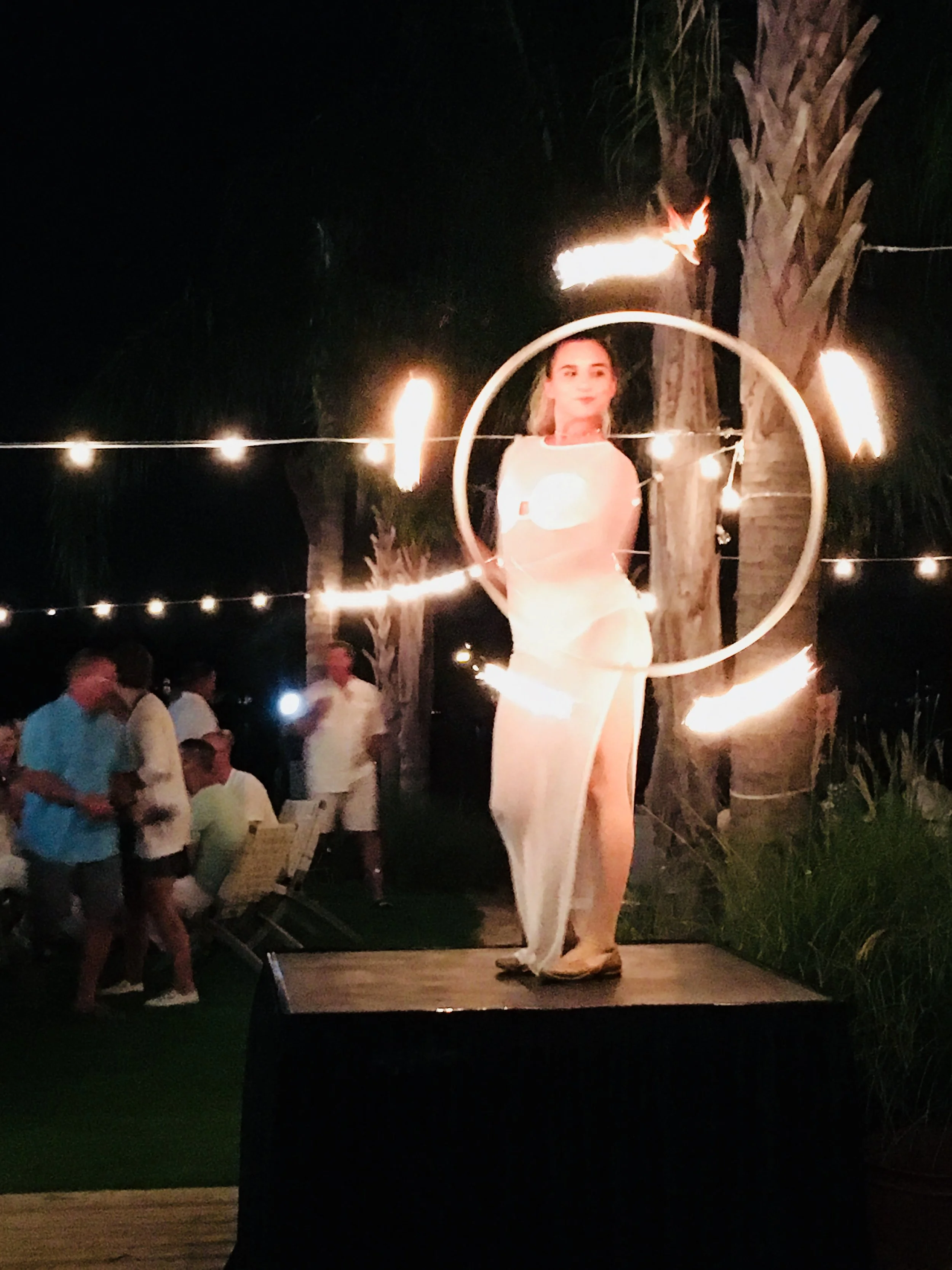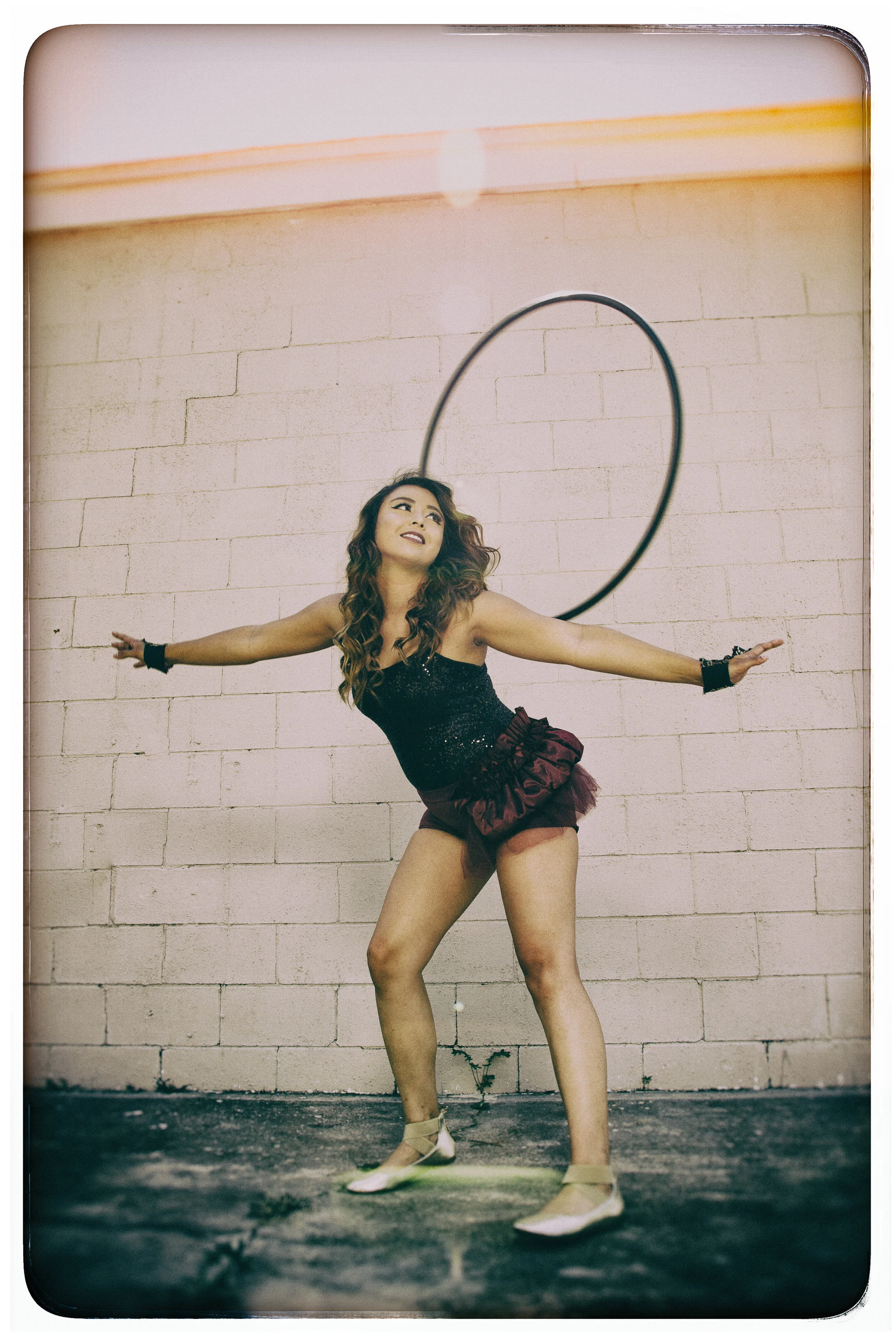 An energetic dancer performs gravity-defying feats, manipulating hoops in mesmerizing ways!