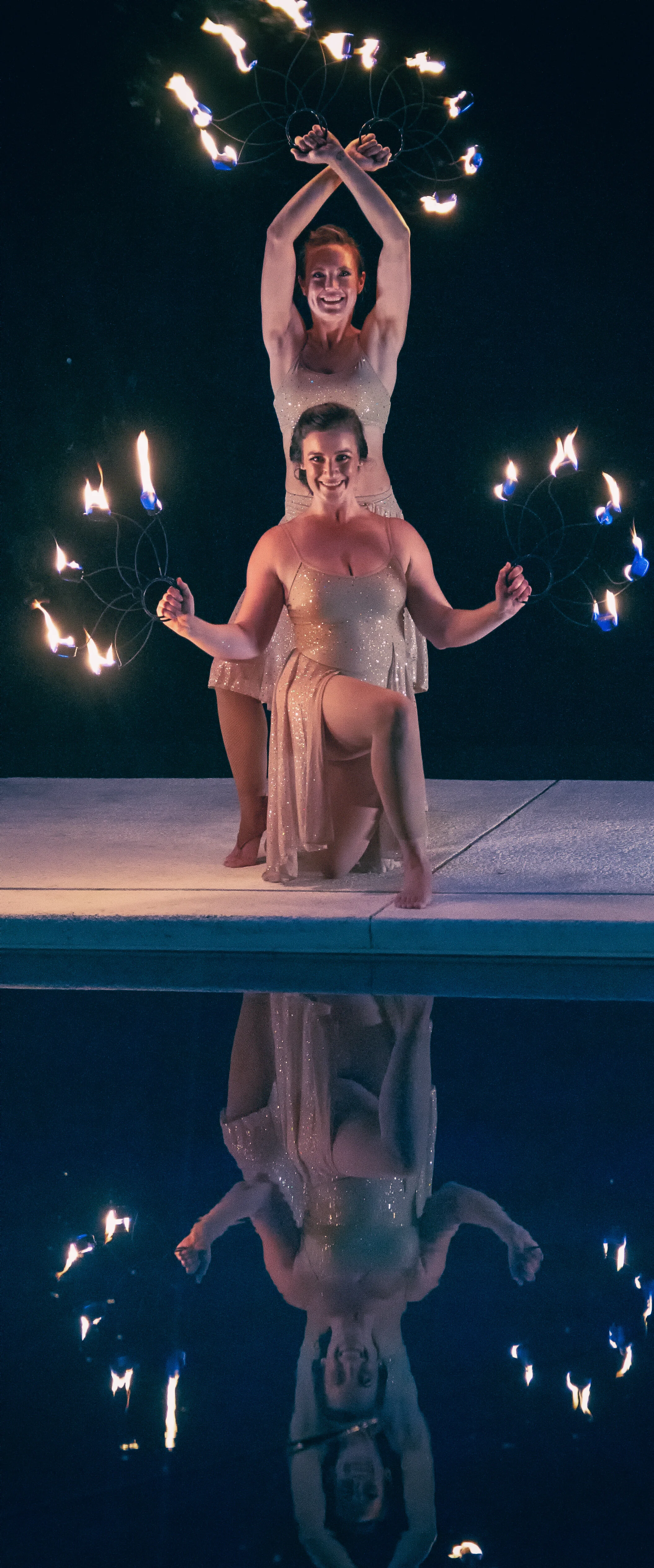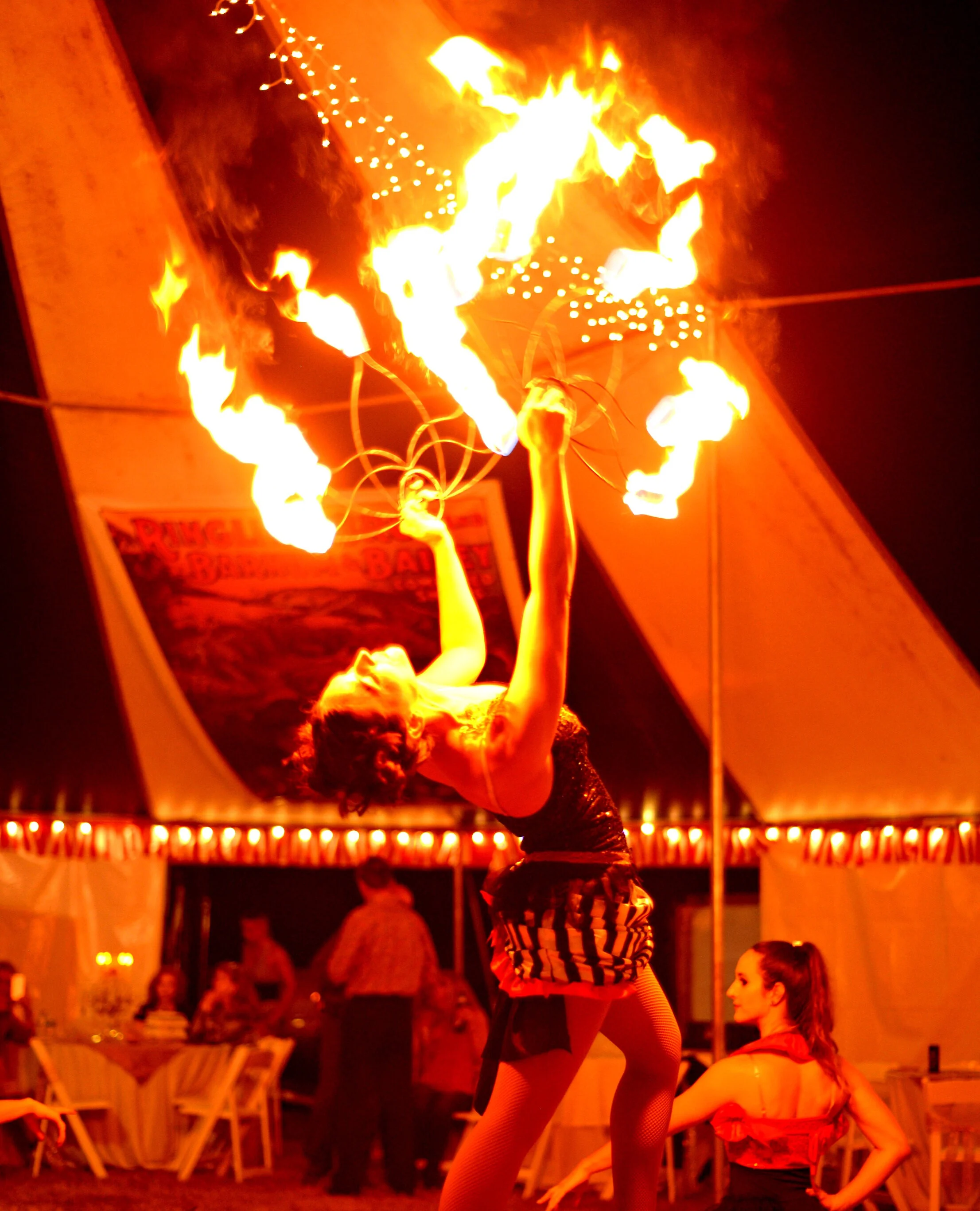 Heat up the party with a delightfully daring fire act! Our fire performers skillfully manipulate poi, fans, staffs, palm torches, and clubs to safely spin fire and enthrall guests. We also offer fire breathing and fire eating to further astound and amaze! Fire acts include a specially-trained assistant taking the role of Fire Safety and ensuring the well-being of the audience, the venue, and the performer.